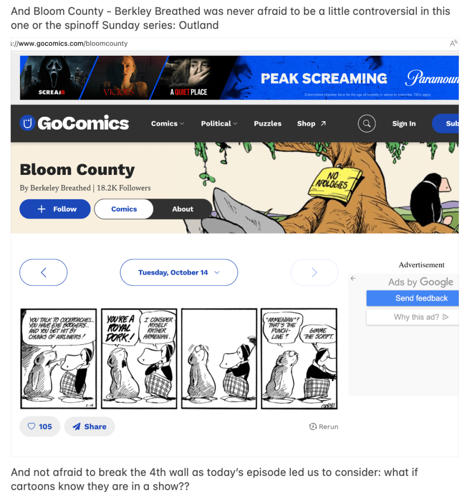 And not afraid to break the 4th wall as today’s episode led us to consider: what if cartoons know they are in a show??