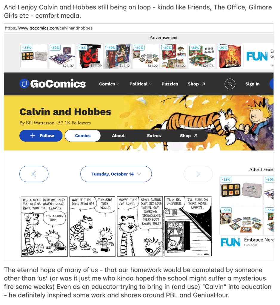And I enjoy Calvin and Hobbes still being on loop – kinda like Friends, The Office, Gilmore Girls etc – comfort media.