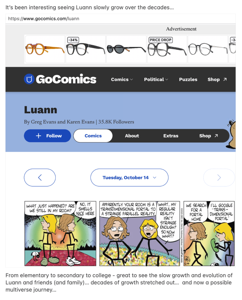 From elementary to secondary to college – great to see the slow growth and evolution of Luann and friends (and family)… decades of growth stretched out… and now a possible multiverse journey…