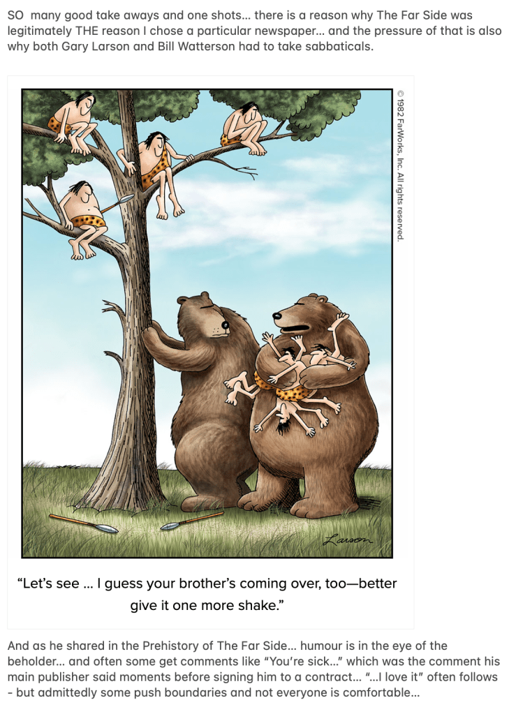 And as he shared in the Prehistory of The Far Side… humour is in the eye of the beholder… and often some get comments like “You’re sick…” which was the comment his main publisher said moments before signing him to a contract… “…I love it” often follows – but admittedly some push boundaries and not everyone is comfortable…